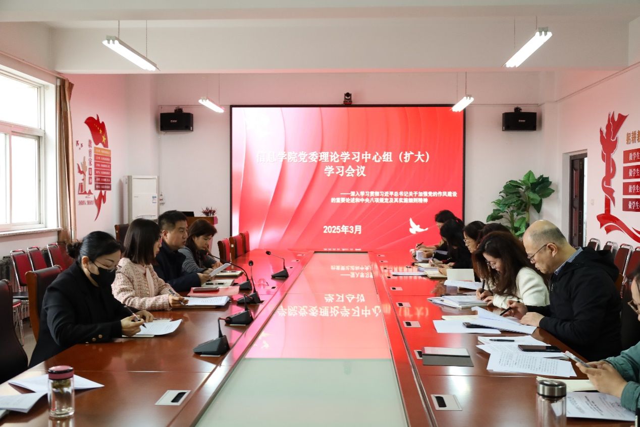 3月27日上午9点,信息学院召开党委理论学习中心组(扩大)学习会议,深入学习贯彻习近平总书记关于加强党的作风建设的重要论述和中央八项规定及其实施细则精神。学院党委书记高萍领学并主持会议,信息学院领导班子、全体党委委员、全体行政人员、全体辅导员、各党支部书记参加学习。