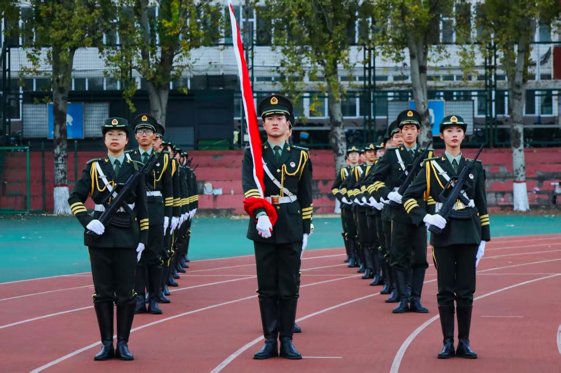 全体师生肃立行注目礼,嘹亮的国歌在操场上空回荡,每一句歌词都激荡起师生心底的爱国热忱。
