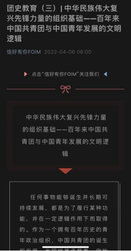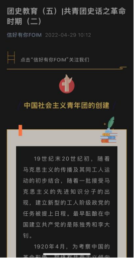 公众号“信好有你FOIM”上开辟“团史教育”专栏,推进理论学习入脑入心,引导青年学史知史,爱团爱党,赓续红色血脉,唱响“请党放心,强国有我”最强音。